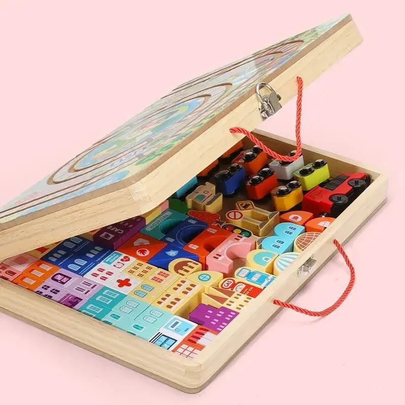 Kids can construct their own railway system using the Montessori Wooden Toy Train and city building blocks, fostering imaginative play and cognitive development while enjoying screen-free learning.